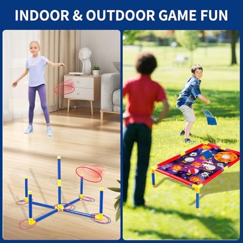 Carnival Bean Bag Toss: Das Set beinhaltet 6 kleine Bälle, 6 Beanbags und 12 Ringe (davon 6 groß und 6 klein), die für die Beanbag- und Ringwurfspiele verwendet werden. Kinder können das leichte und tragbare Cornhole-Set selbstständig unter Anleitung aufbauen. Diese Aktivitäten fördern nicht nur die motorischen Fähigkeiten, sondern auch die Präzision und den freundschaftlichen Wettbewerb unter den Kindern.